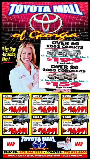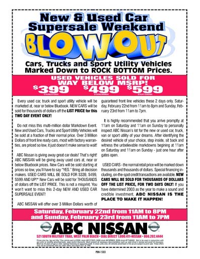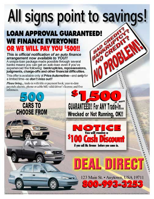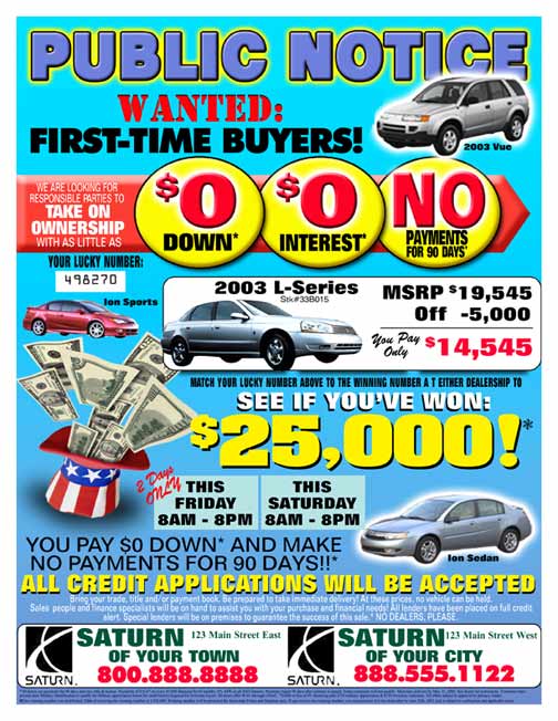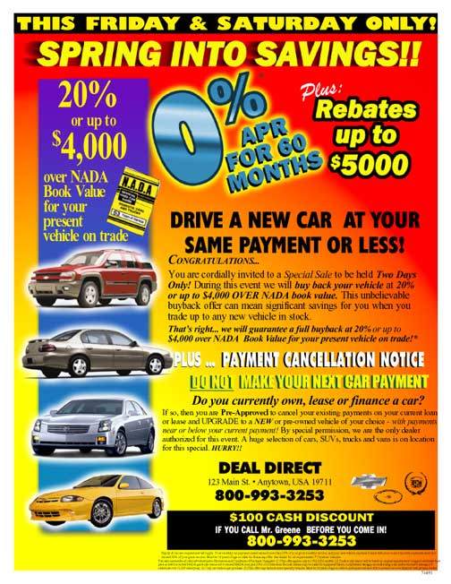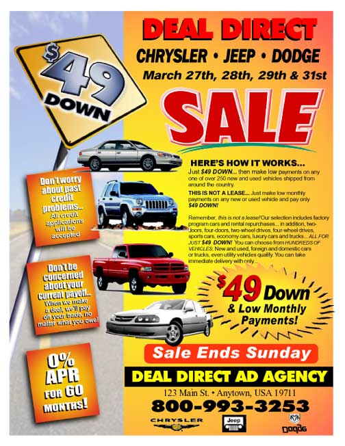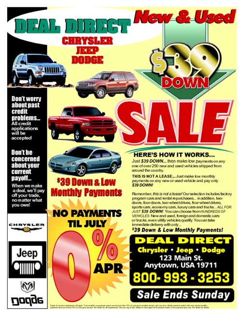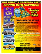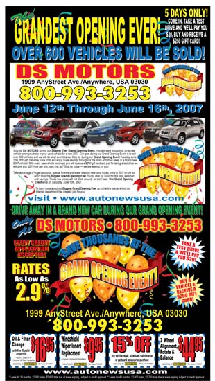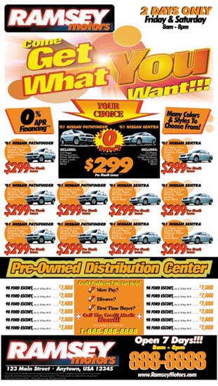 Our art department can take your car ad copy from start to finish and send to the publication of your choice, on your behalf. Automotive ads, used cars, new auto deals and all other automotive newspaper ads are what we do best!